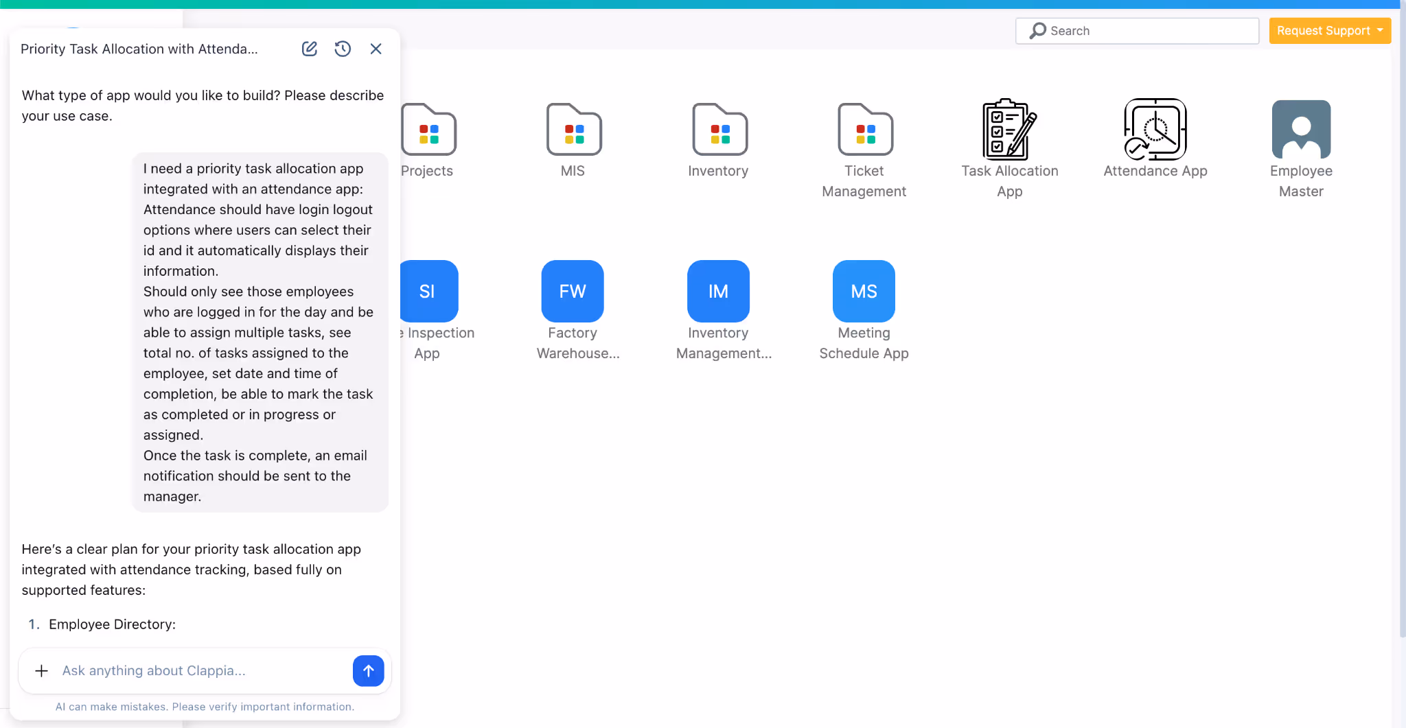 If you’re hesitant about using AI because you prefer manual control, you don’t have to choose one or the other. Clappia lets you customise everything manually using its no-code builder, even after the AI has generated your app. You don’t need technical expertise to do this, and if you ever need guidance, you can always raise a support request and get help. This balance of AI generation and user control makes it easier for businesses to adopt AI without feeling locked in or unsure of what comes next.