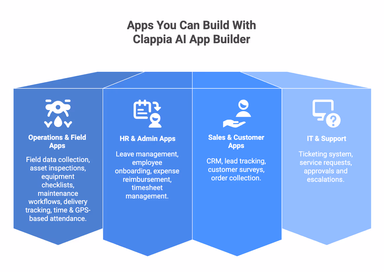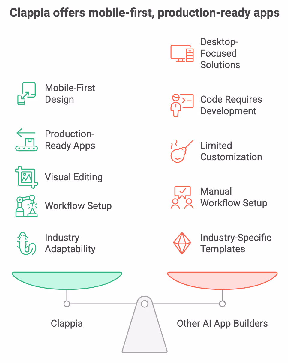 Clappia combines AI-powered app generation with mobile-first design and enterprise-ready capabilities, making it suitable for real business use rather than a demo. Each part of the platform is built to support how teams actually work, especially when apps need to be used on the field, across departments, or at scale.