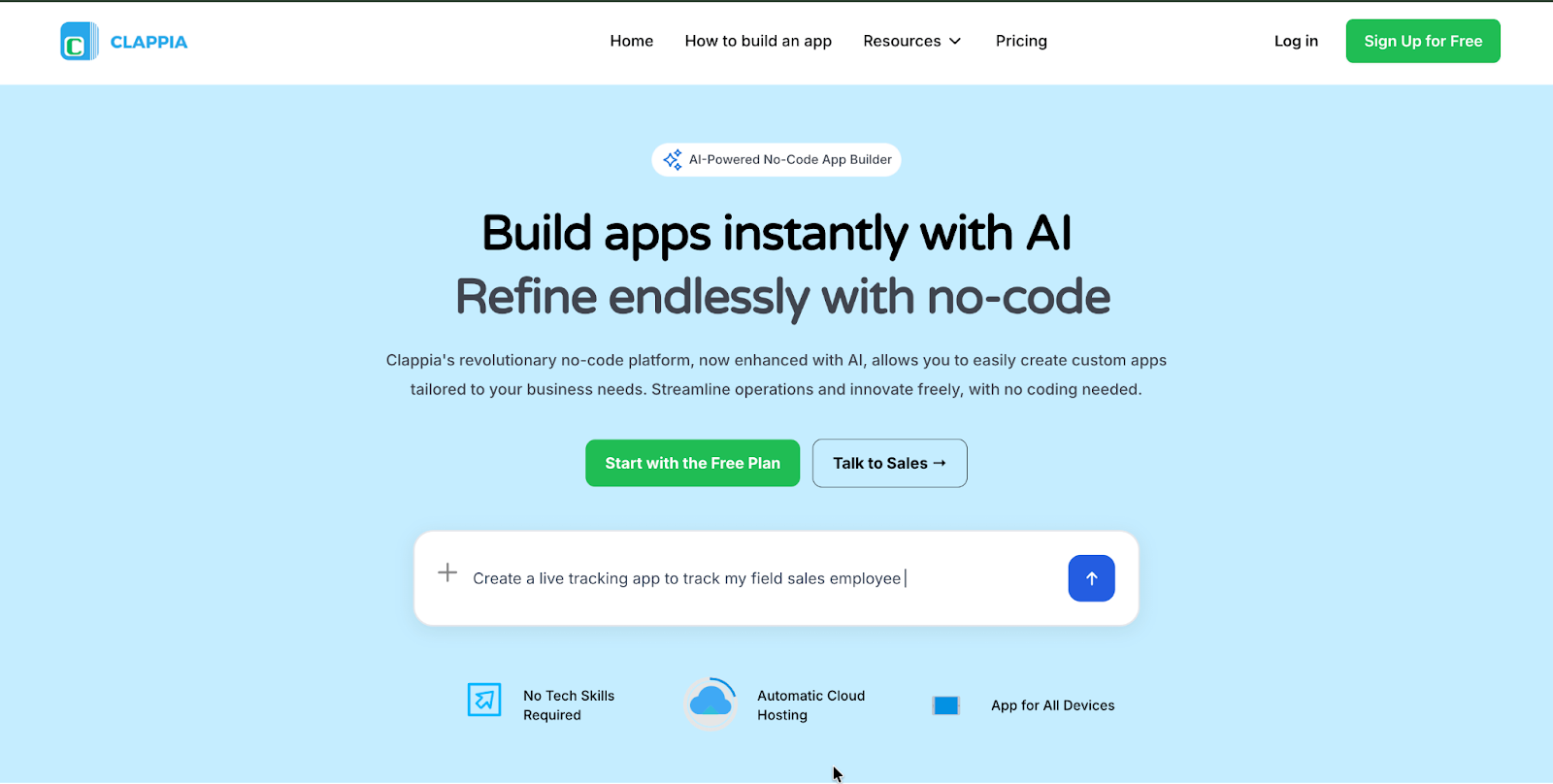 Sign up for Clappia and access the AI Assistant. The free plan provides unlimited apps for up to 100 users—perfect for testing and small team deployments.