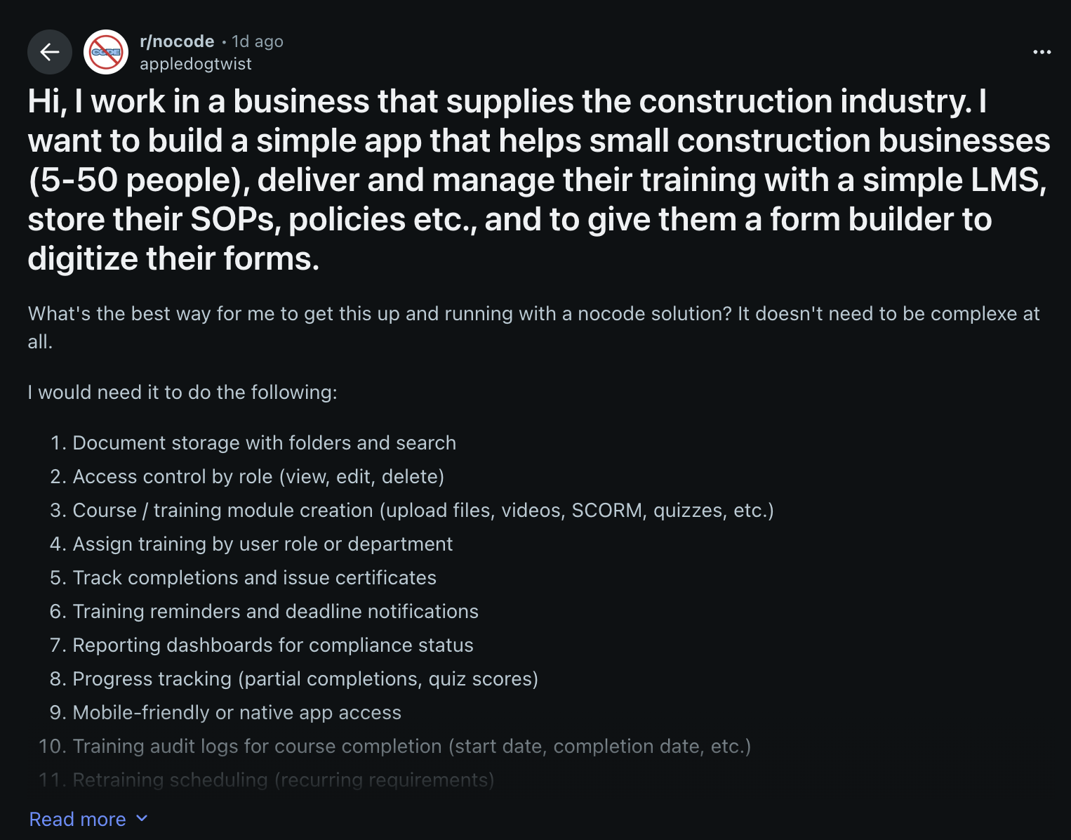 This straightforward request posted on r/nocode by a construction industry professional sparked a conversation that's resonating across small business communities. The user's frustration? Traditional learning management systems are expensive while offering features construction crews will never use—virtual classrooms, gamification, and complex course authoring tools designed for corporate training departments, not job sites.