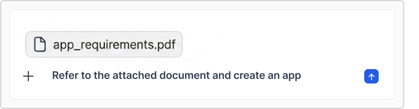 For PDF-based app creation, click the plus icon in the chat input box to upload your document. Alternatively, you can simply type your app requirements directly if you don't have a PDF. The AI accepts various formats including: