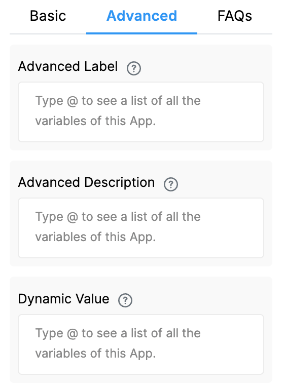 When a field is created, its variable name is derived from the label you set in the Basic tab. That variable name is what you must use in formulas, workflows, and other logic. The visible label or description shown by Advanced Label / Advanced Description does not change the variable name.