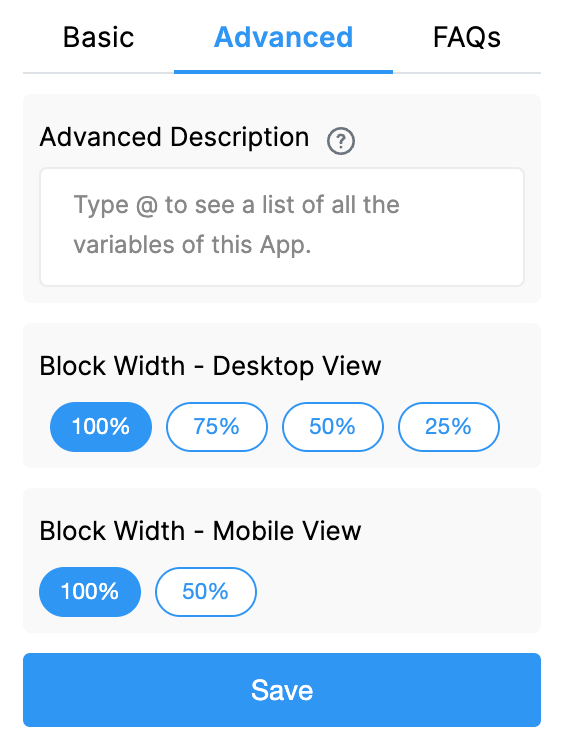 Desktop View: Sets the width of the Validation block in the desktop view. Options are 100%, 75%, 50%, or 25%.