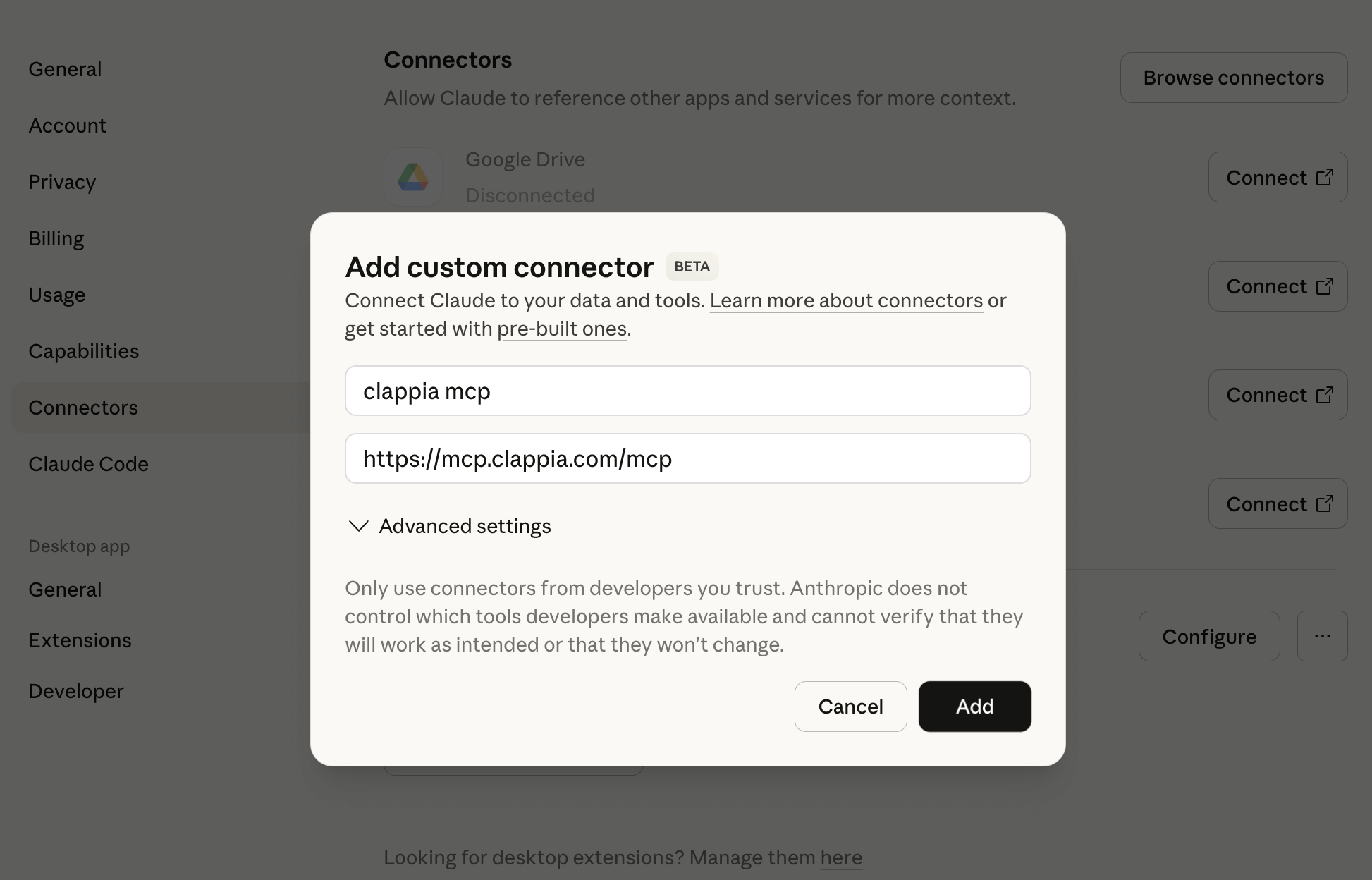 Open Claude Desktop > Settings > Connectors > Add custom connector. Give a name and add the URL: https://mcp.clappia.com/mcp