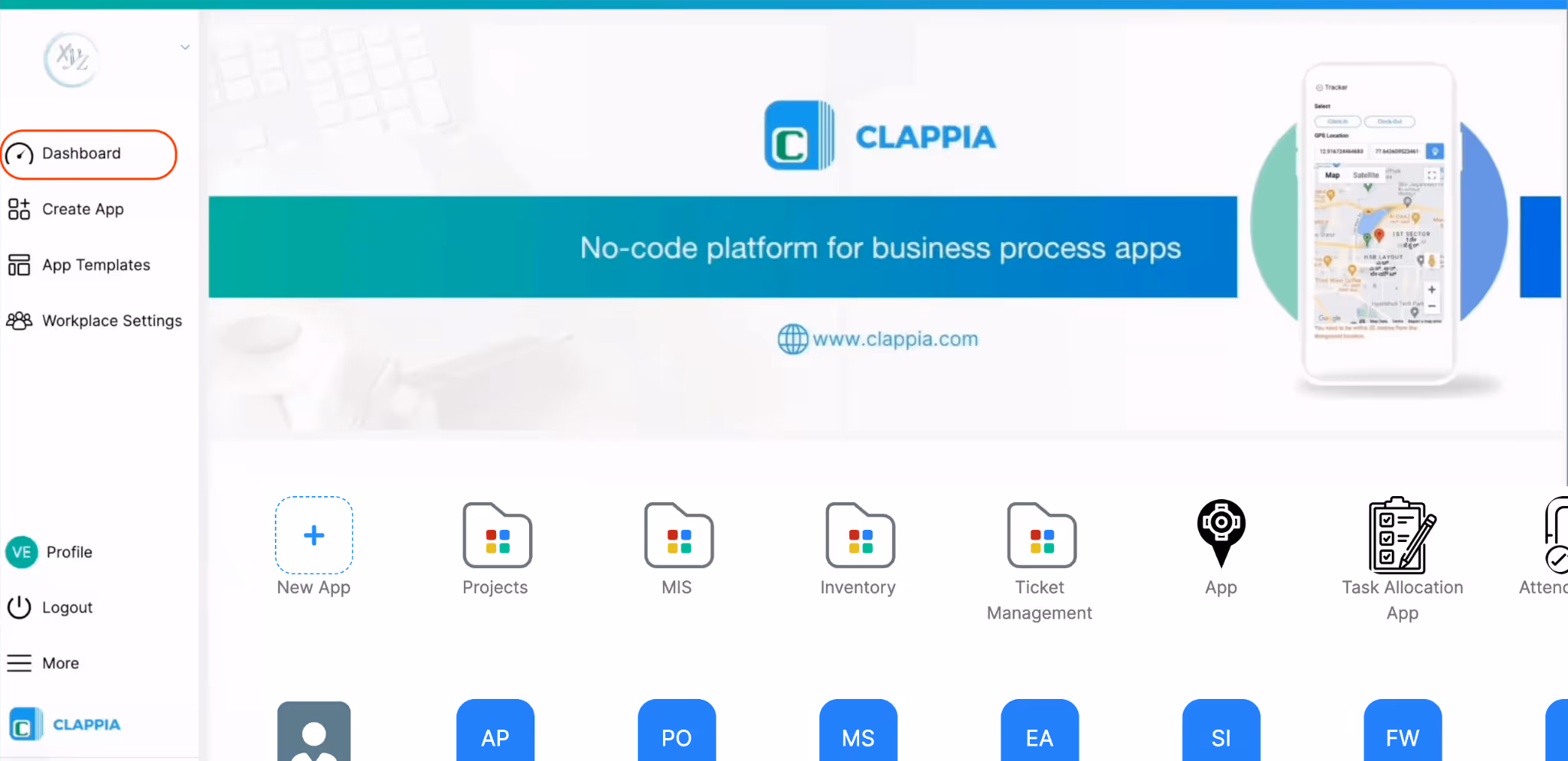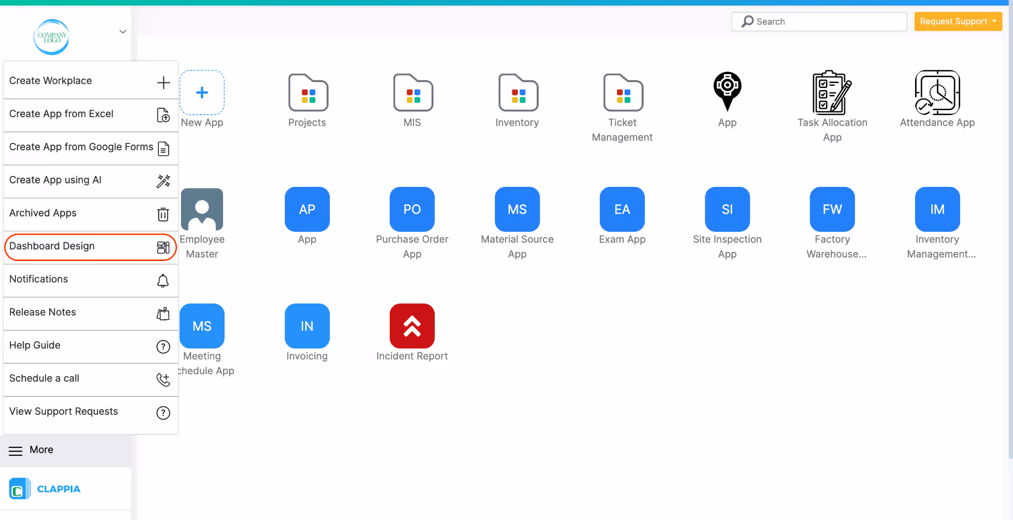 Sign in to your Clappia workplace. From the left navigation panel, click More > Select Dashboard Design.
