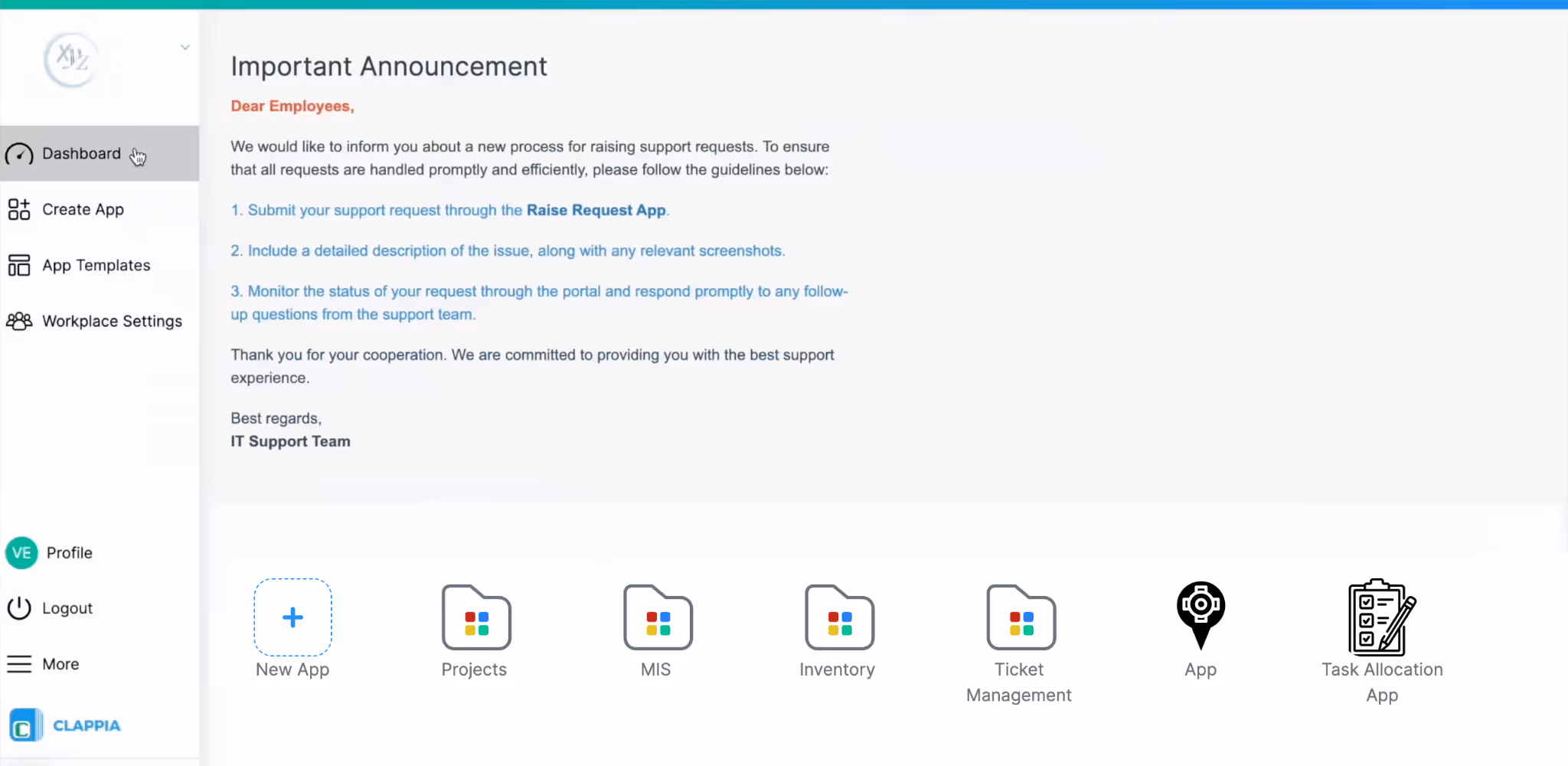 Dashboard Design in Clappia lets you customise what users see immediately after they log in to your workplace. Instead of a plain dashboard, you can add visual and informational elements such as banners, announcements, images, videos, embedded content, or custom HTML blocks.