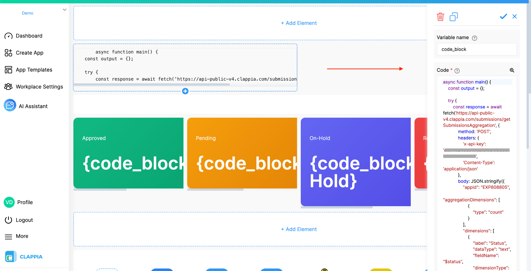 The script inside the Code Block calls the Clappia Public API and requests a summary of submissions from the app. Instead of retrieving every submission individually, the request asks for an aggregated count of submissions grouped by their Status field.