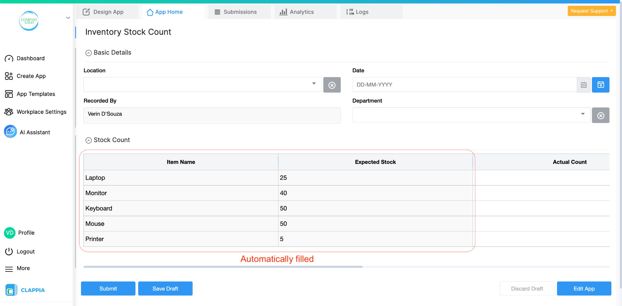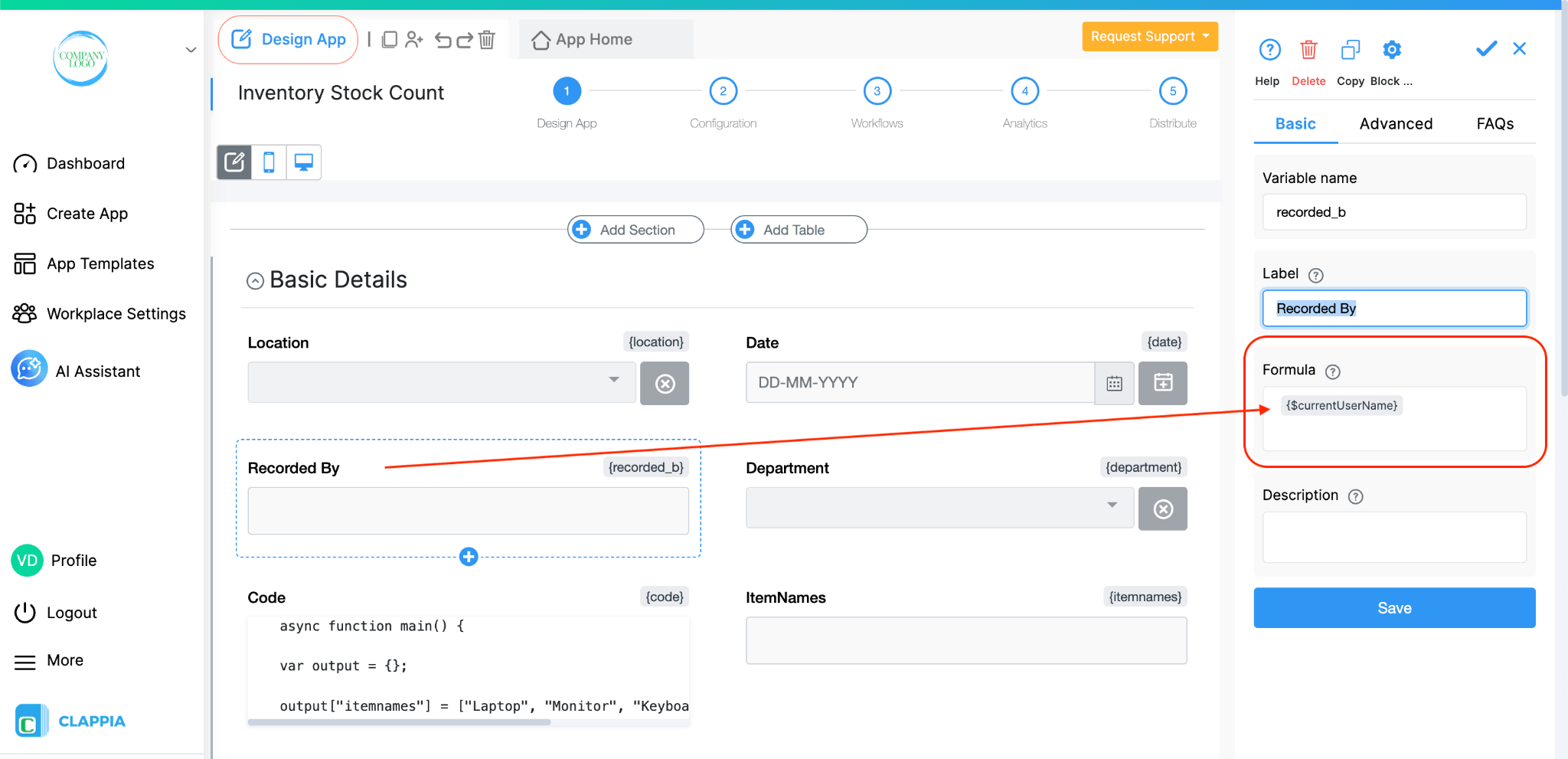 This is a system variable that automatically pulls in the name of the logged-in user, so the person conducting the count does not need to type their name manually. This will only work for those users logged in to Clappia.