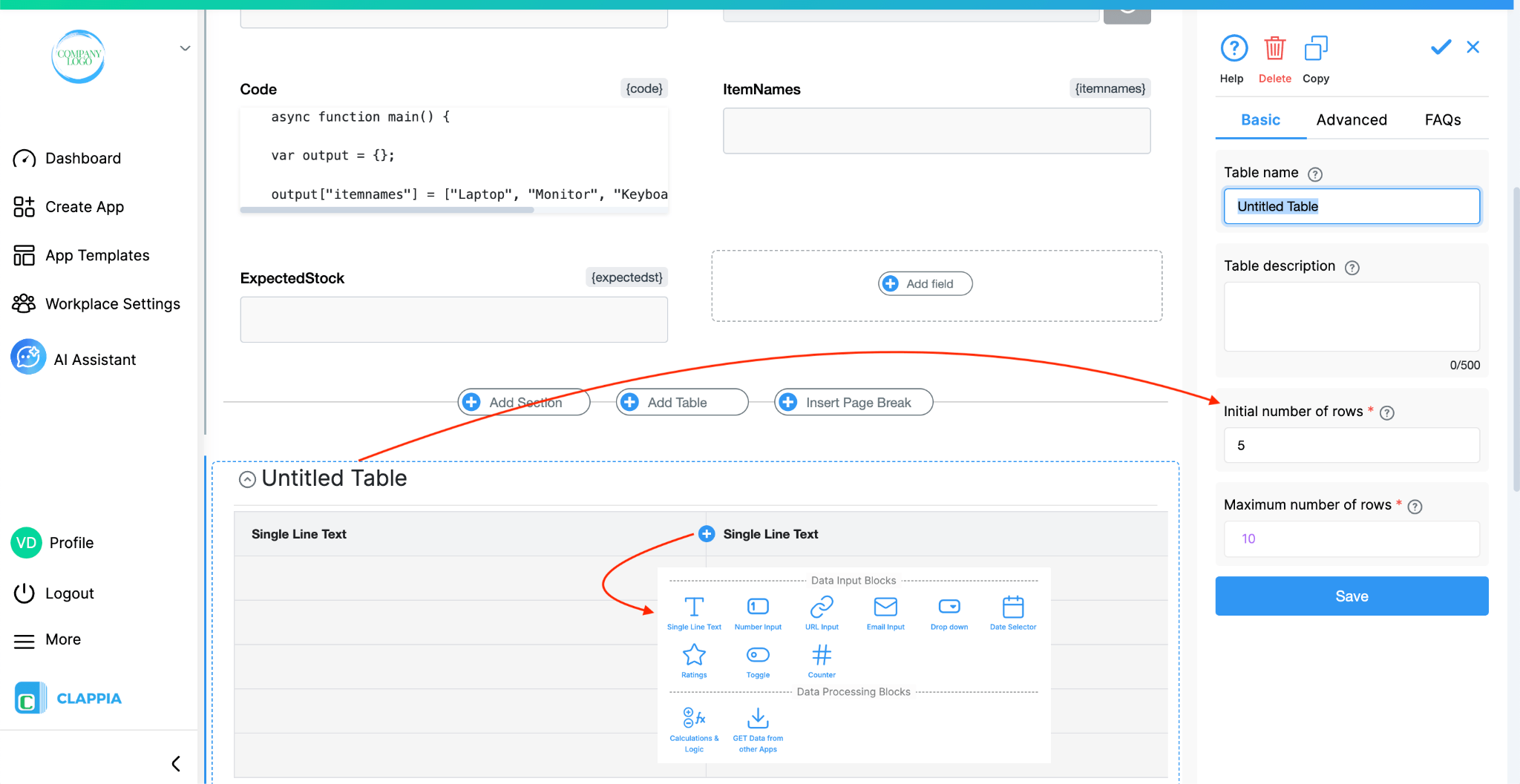 In Clappia, this is done by combining a Code block, Calculation blocks, and the Table. The Code block generates or fetches your list of values. Calculation blocks bridge those values into the table. The table then renders each row with the pre-filled columns already populated, while the remaining columns stay editable for the user to complete.