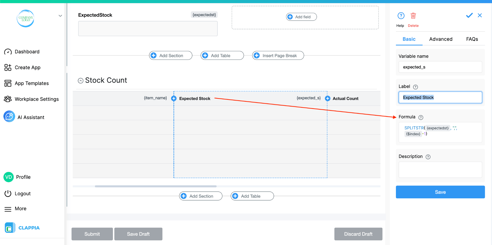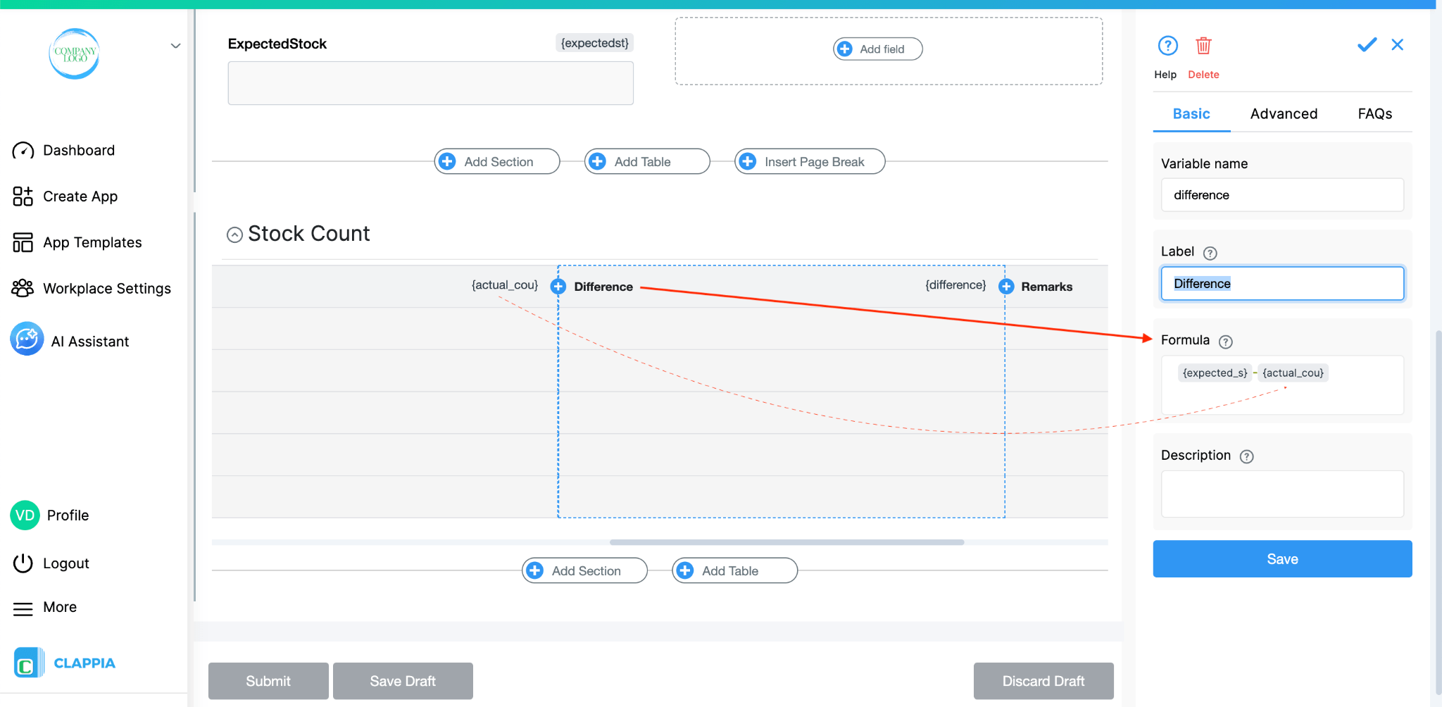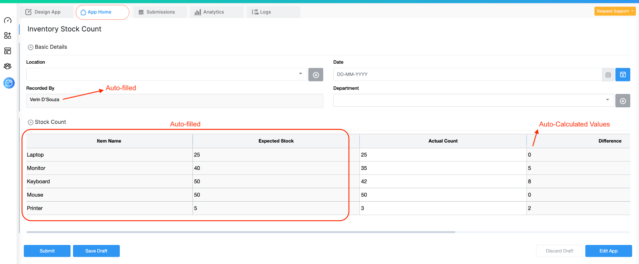 where {expected_s} and {actual_cou} are the variable names of the Expected Stock and Actual Count columns respectively. This would auto-calculate the variance for each row the moment the user enters their actual count.