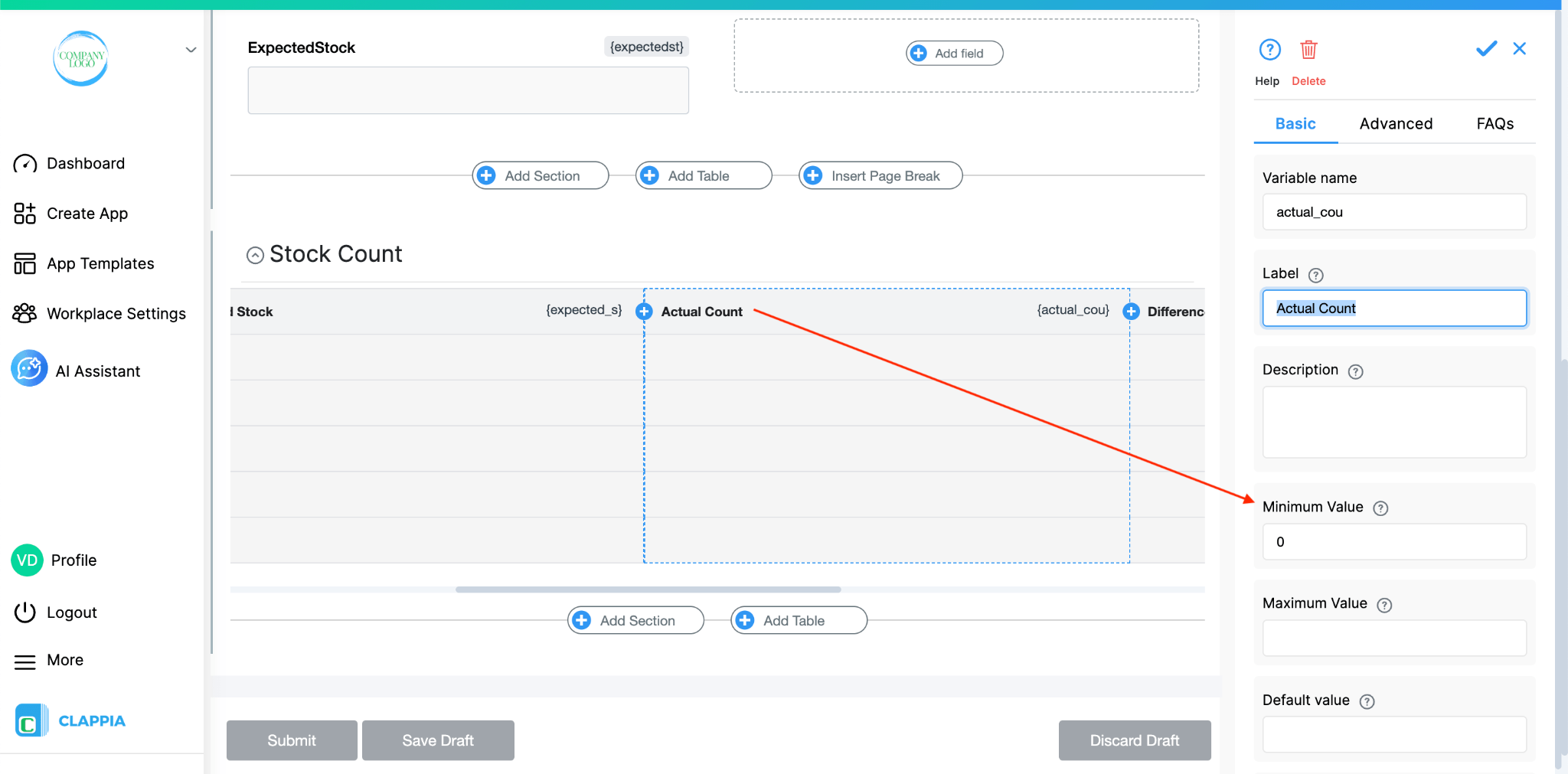 In the right panel, set Minimum Value to 0 to prevent negative entries. Leave the Default value empty. This column is fully editable, the user physically counts the stock and enters the number here.
