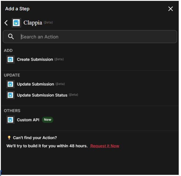 3. Choose an action: Create Submission, Update Submission,Update Submission Status or Custom API.