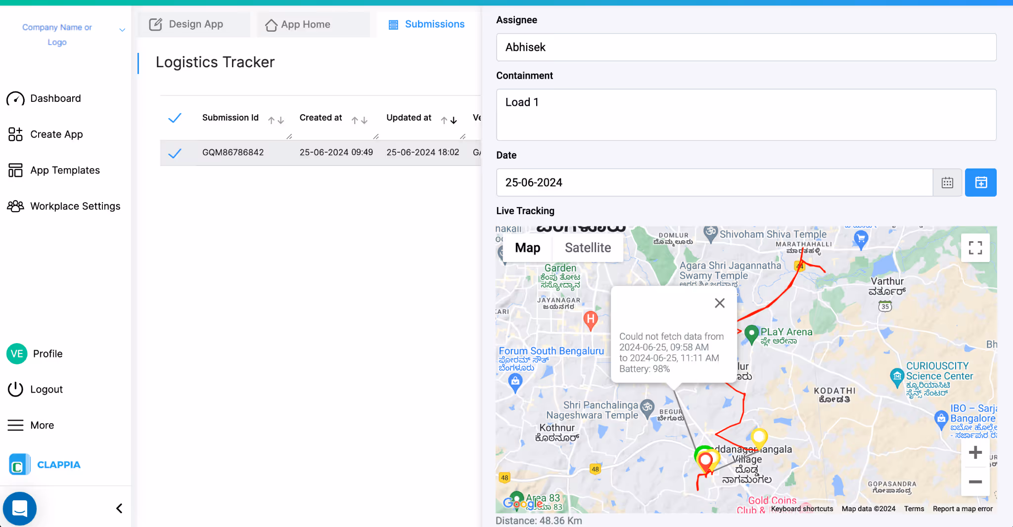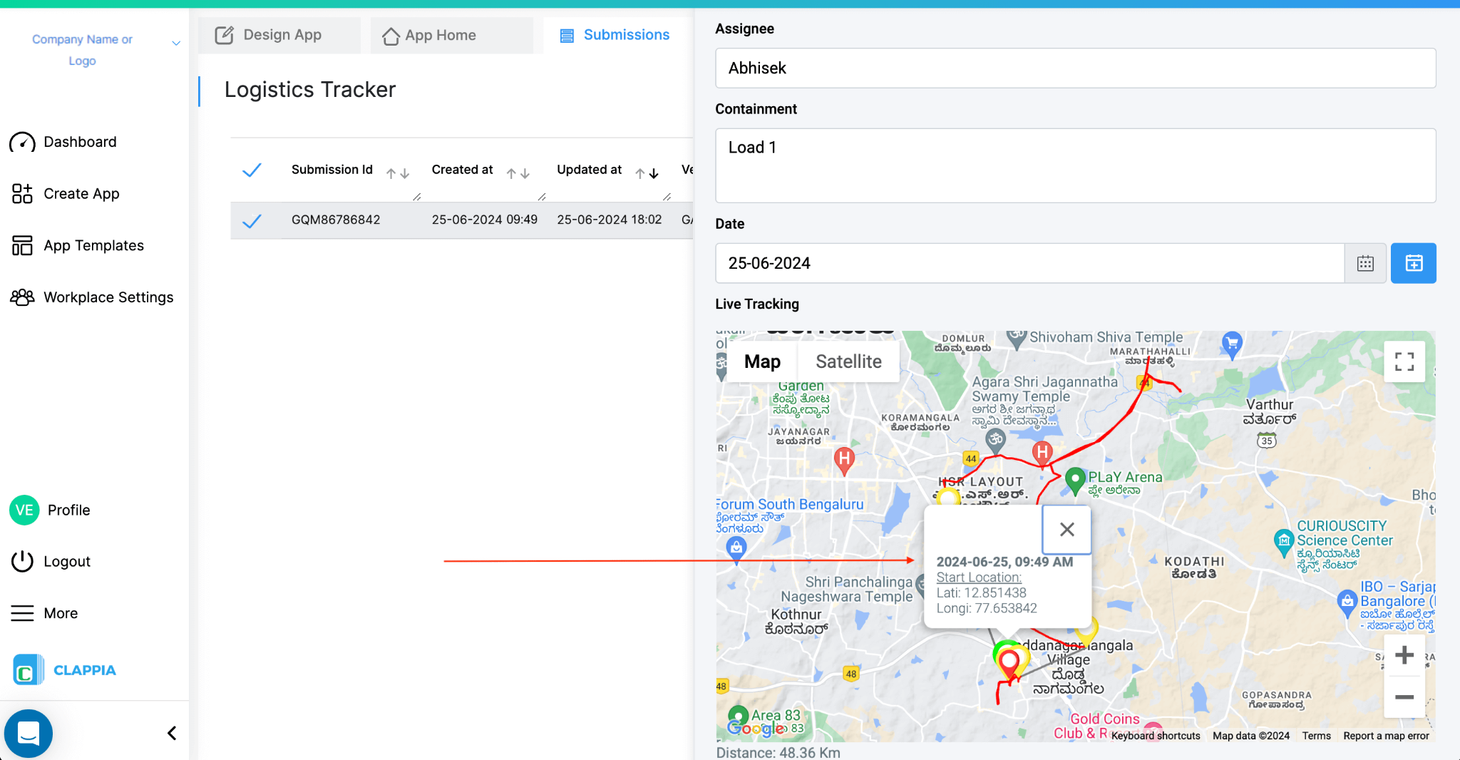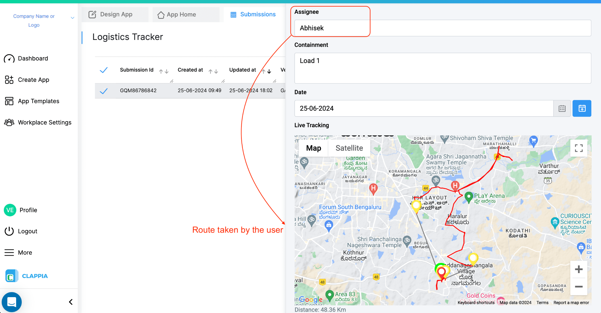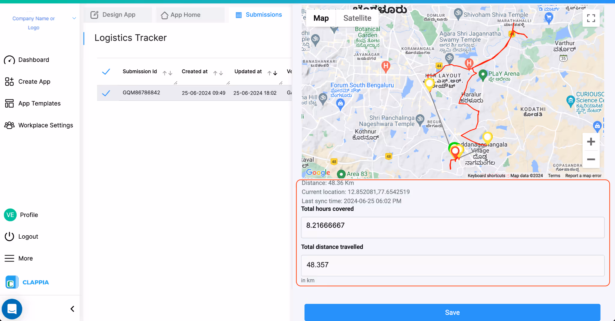 Live Tracking data generated in Clappia is stored along with the submission in which tracking is used. This allows the live tracking route and related details to be viewed later as part of the submission record.
