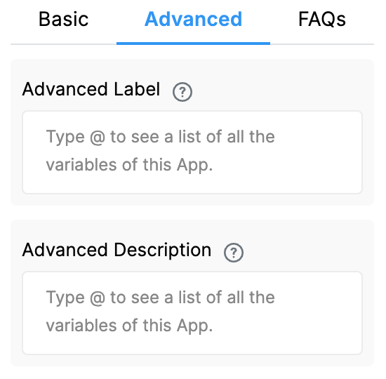 When a field is created, its variable name is derived from the label you set in the Basic tab. That variable name is what you must use in formulas, workflows, and other logic. The visible label or description shown by Advanced Label / Advanced Description does not change the variable name.