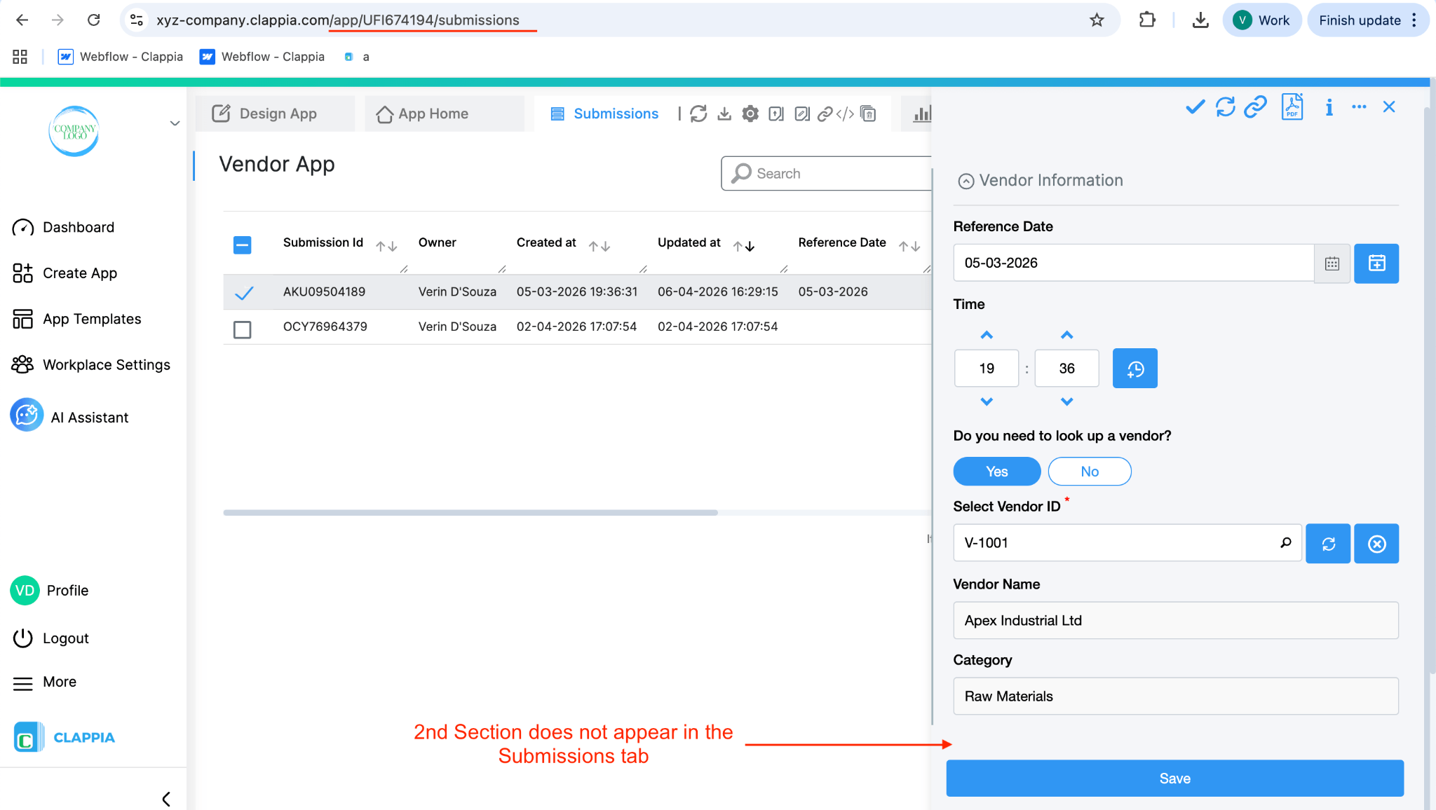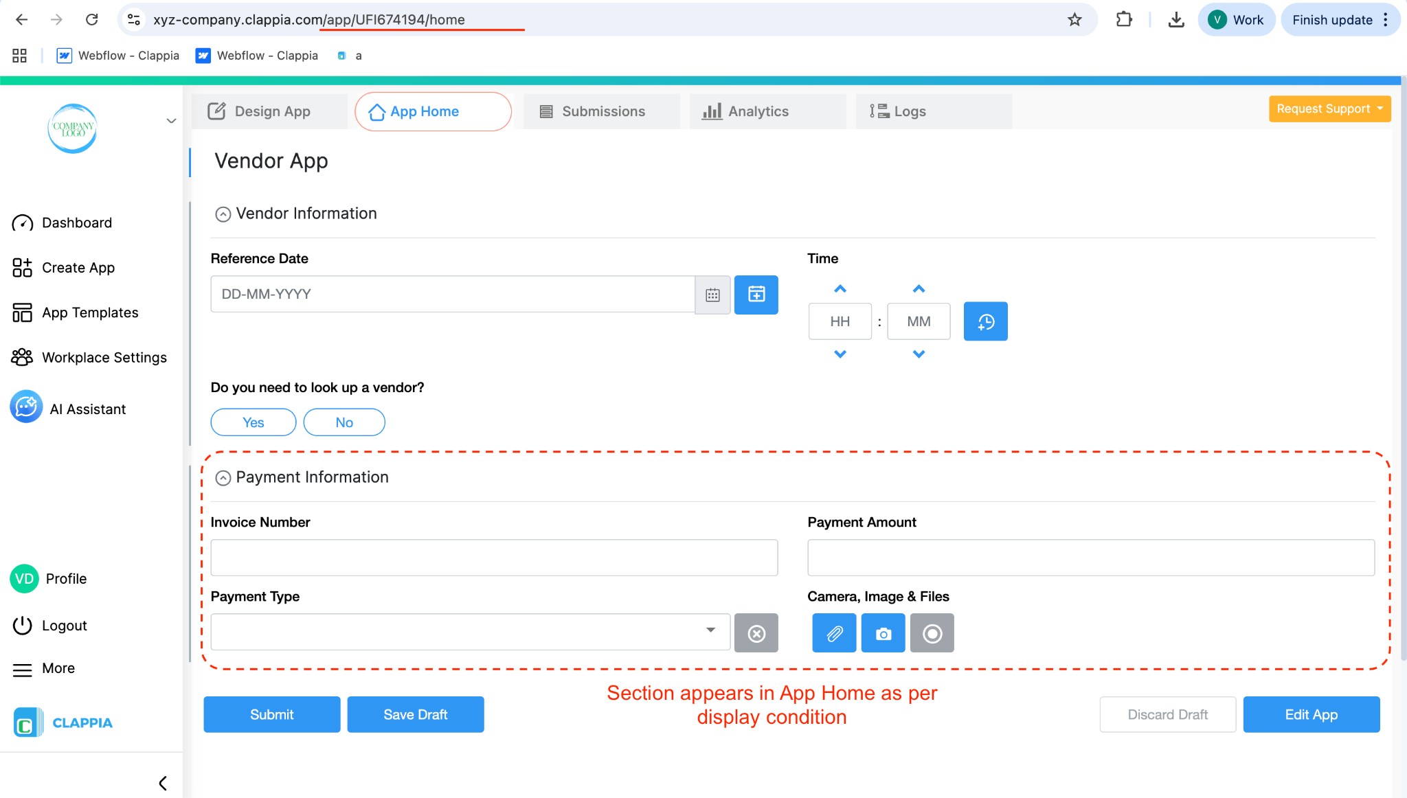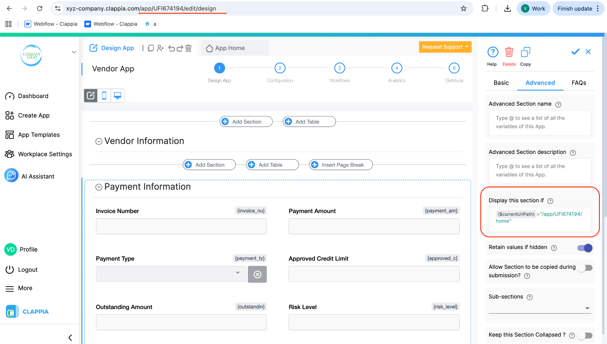 Note: If this condition is used, the section will not be visible in the Clappia mobile app, since the mobile app does not use the same page paths.