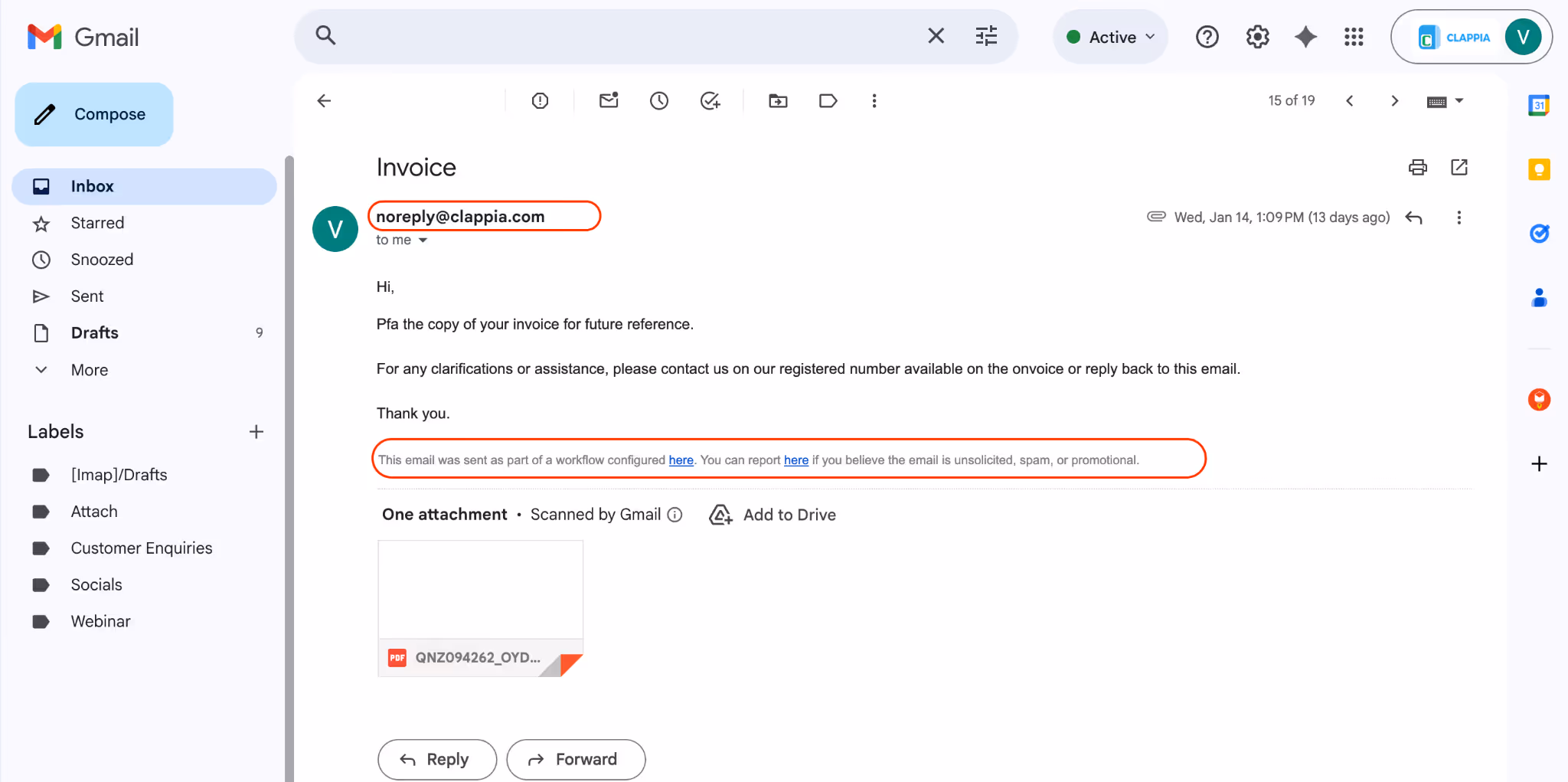 When an Email workflow step is executed, Clappia sends the email using a default sender address.