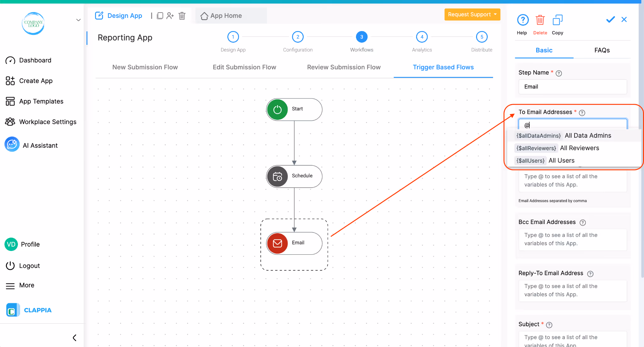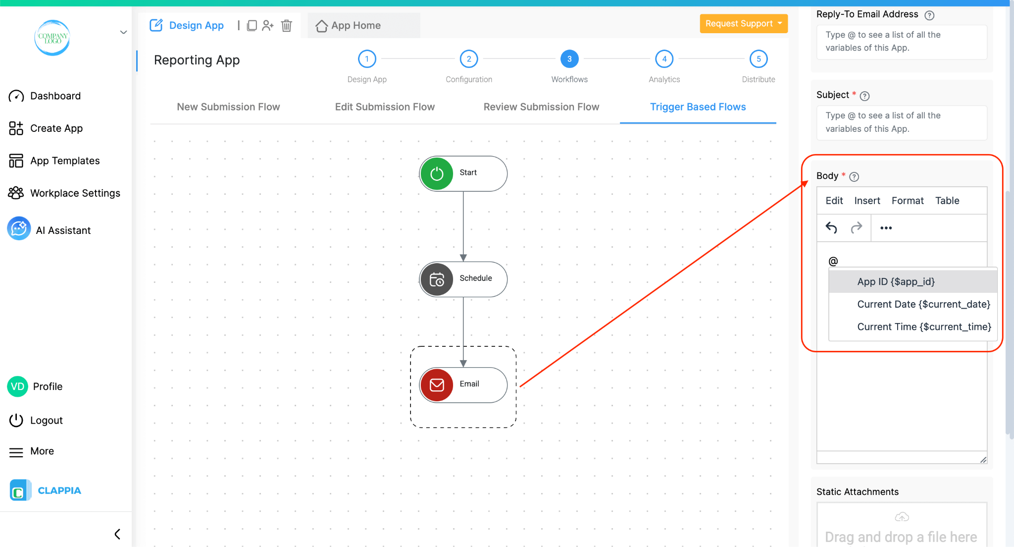 Go to Design App > Workflows > Trigger Based Flows. Click on Start to add the Schedule workflow.
